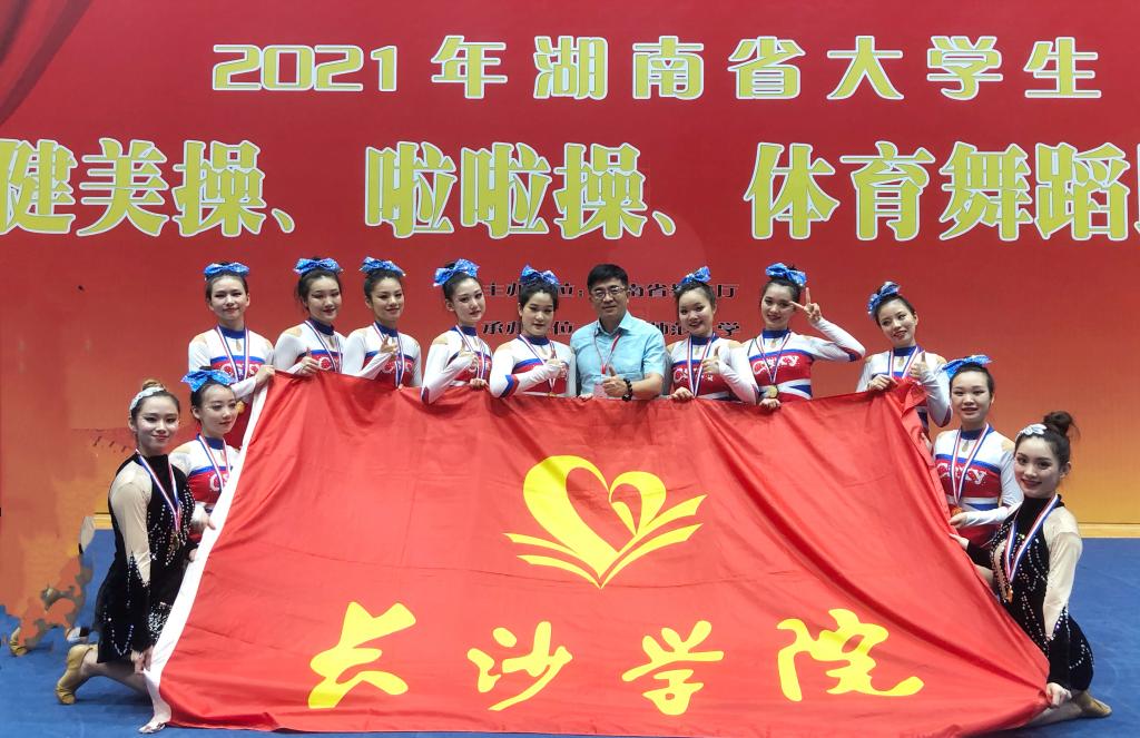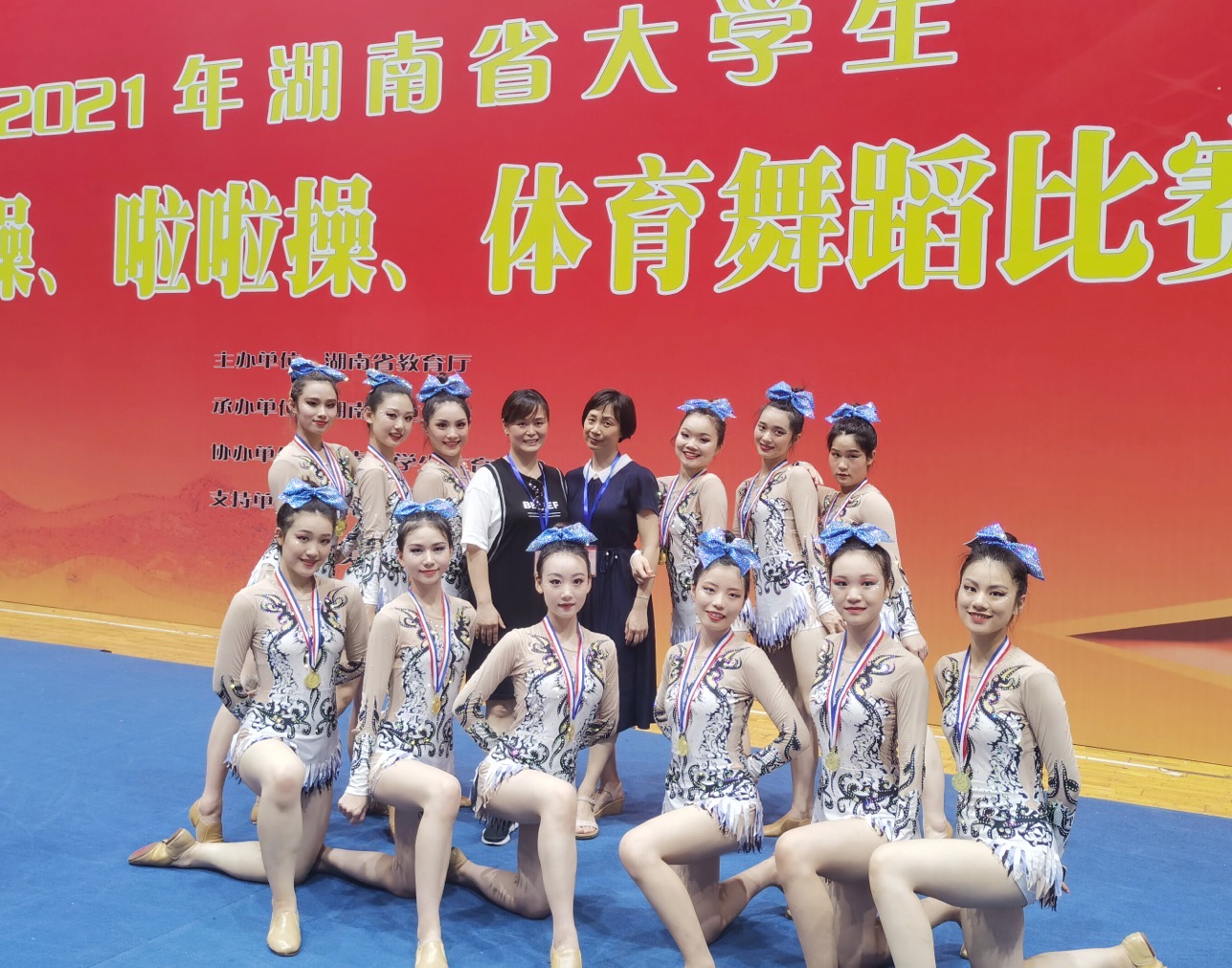 6月15日-24日,由湖南省教育厅主办的2021年湖南省大学生健美操、啦啦操、体育舞蹈比赛在湖南师范大学体育馆隆重举行。我校代表队在体育学院副院长、领队刘战红,教练员刘丽丽的带领下,取得了三金一银、团体总分第一名的优异成绩。