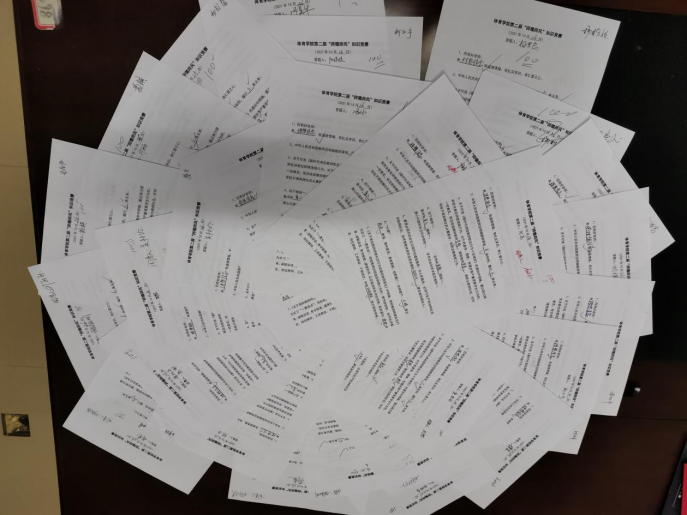 随后,开展了“体育学院第二届师德师风知识竞赛”,对大家的学习情况进行随堂考试,并通过相互评阅、修改试卷,更进一步加深全体教职工学习效果。