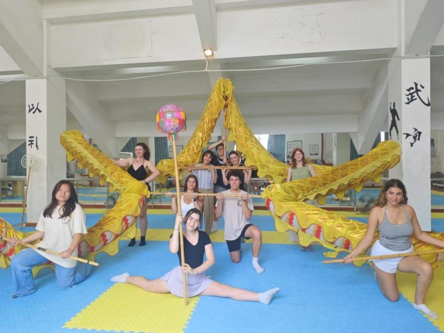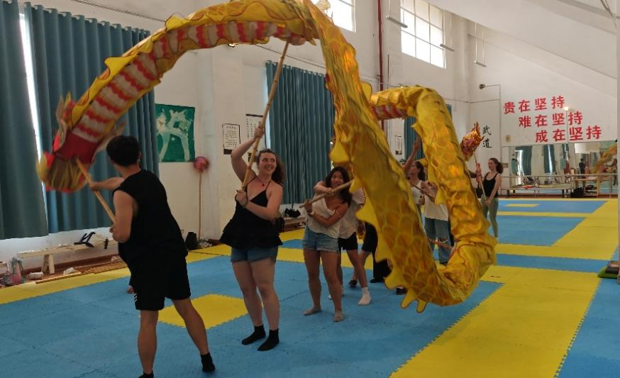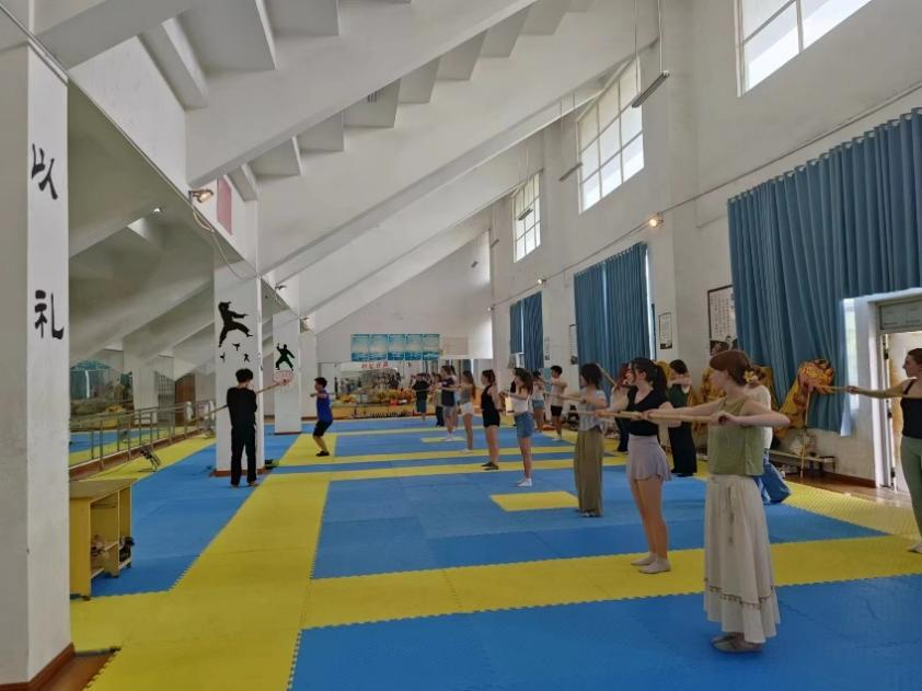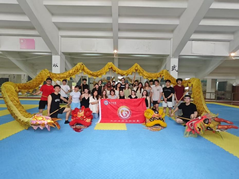 鼓点铿锵,龙身翻腾!6月6日下午,长沙学院天健体育馆内跃动着一片火热的"中国红"。龙狮协会迎来了17位特殊学员——美国波士顿东北大学社科人文学院"东学西鉴"暑期文化交流团的学子们,一场跨越太平洋的中华传统文化深度体验在此展开。