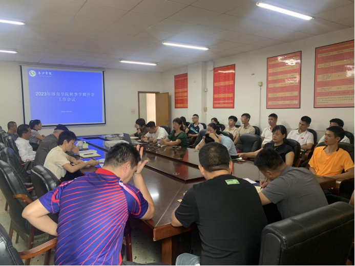 2023年9月4日上午9:30,体育学院2023年秋季新学期工作会议在天健体育场荣誉室召开,在校全体教职工参加了会议,会议总结回顾了过去一学期的体育工作,部署了新学期工作,进一步统一思想、凝聚共识。会议由体育学院院长邓晖主持,总支书记曾一兵出席会议并讲话。