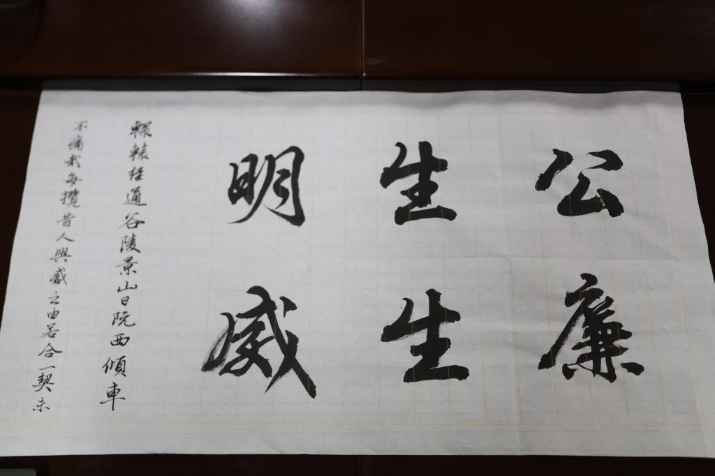 杨芳良老师悬腕写出了“公生明,廉生威”几个字后,引起了现场观众和小朋友的惊声称赞。按照杨老师所传授的方法,大家兴致盎然地拿起毛笔,调整握笔姿势,各自选取廉政主题相关的诗词警句作为内容,挥毫泼墨,各展风采,一笔一划书写风清气正,让廉政文化扎根于心。最后,几个极具趣味的猜廉洁字谜、廉政文化闯关答题的小游戏为活动画上圆满句号。