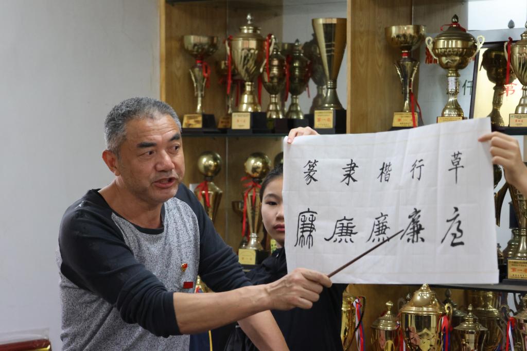 活动开场,全体教职工合唱了一首《歌唱祖国》,在歌声中唱出对祖国的热爱、唱出廉政文化的旋律、唱出清正廉洁的氛围,拉开了书法课堂的序幕。原体育教学部副主任杨芳良作为主讲人,向在场的教职工及职工小孩上了一堂别开生面的廉政书法教育课,杨芳良老师以“廉”为例介绍了书法的5种字体风格和特点,重点讲解了枕腕、立腕、悬腕3种书写方式分别对应小字、中等字、大字,以身示范并采取体验式教学。