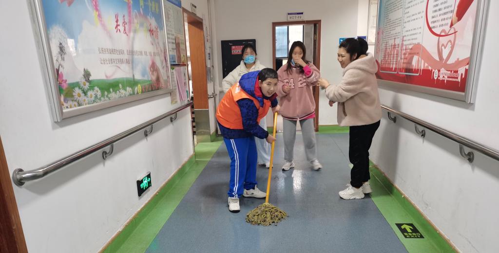 活动期间,在谭老师的带领下,同学们向怡嘉阳光家园的这群特殊的朋友们分享了雷锋故事与观看残奥会的所感。在谭老师带头与残疾朋友们的交谈下,怡嘉阳光家园的室内洋溢着欢快明朗的气氛,也在此氛围的烘托下响应三月雷锋月,进行了最后的大扫除,谭老师带领同学们与残疾人朋友一起拖地、叠被子、擦窗户等等。