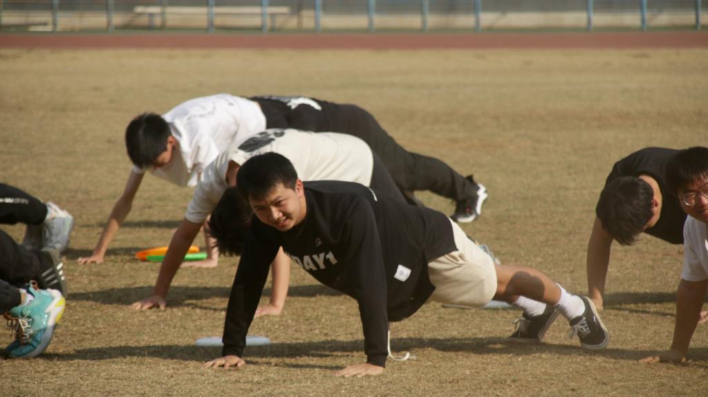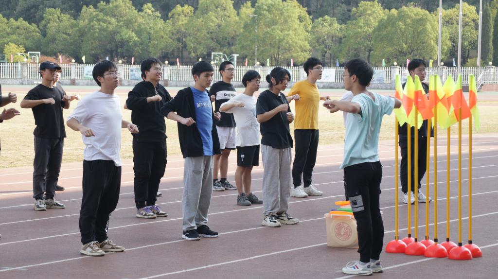 周英华老师提出“坐标法”目标管理,围绕口号“好好学习 天天向上 遇见更好的自己”,按体育老师-班长-组长“三级分层”管理模式开展飞盘教学活动。准备活动由学生轮流领带、课中练习由学生主动设计、课后小结由学生轮流分享,采用这种独特的方式增强了学生对飞盘的兴趣和学习的主动性,培养了学生“听-思-练-说”的综合能力,有利于实现学校培养应用型人才的目标。看课老师们从学生捡飞盘、变化练习队形时主动喊口号、课后分享等细节看到学生脸上洋溢着“我运动 我快乐”的笑脸,感受到学生的自觉、自主与自信。