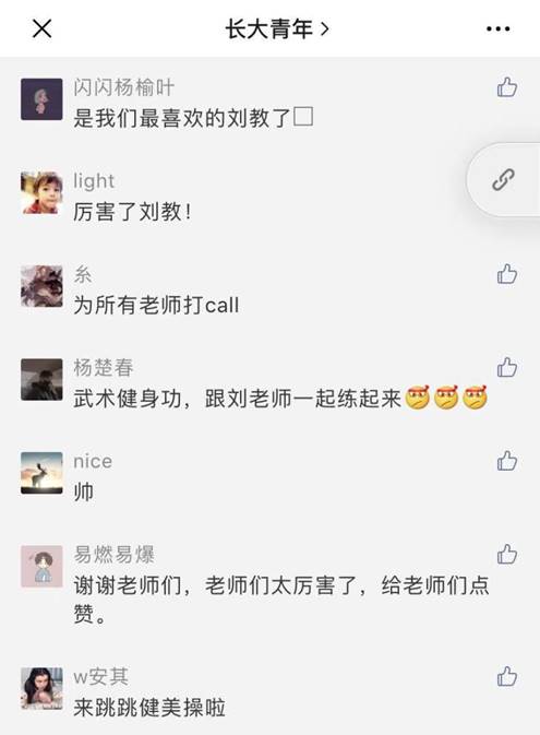 在体育学院教职工的共同努力下,不到4天时间,一共有9名体育老师录制了11个居家运动视频,教全校师生防疫共“健”,并且还有老师正在持续录制输出中。这些视频围绕心肺功能、肌肉力量、身体柔韧、民族传统体育和其他娱乐项目等内容展开,专业化程度高,可操作性强,赢得了师生们的广泛赞誉。“谢谢老师们,老师们太厉害了!”“厉害了我的体育老师!”“马上发给我爸妈看看。”网上的留言迅速增加着。