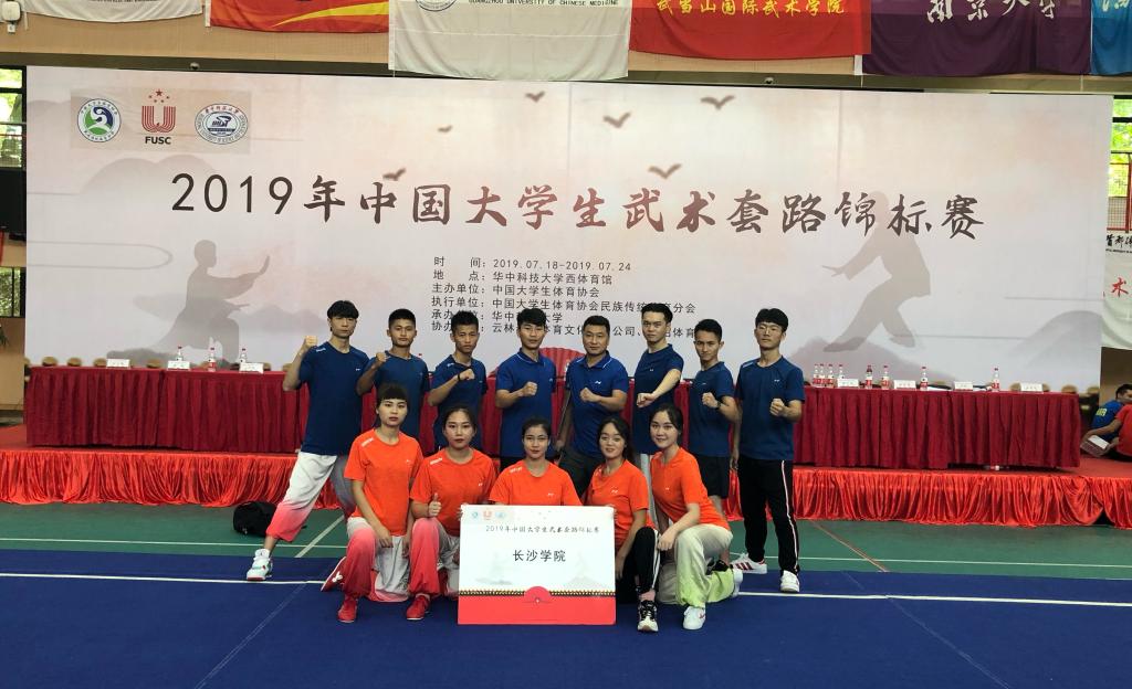 7月23日,2019年中国大学生武术锦标赛在华中科技大学西区体育馆圆满落幕,我校共派出了65女共11名运动员参赛,在校领导的关心指导和领队曾一兵、教练员刘毅军、熊玮的带领下,取得了三金三银三铜、男子团体总分第二、女子团体总分第五的好成绩。刘毅军,熊玮荣获优秀教练员称号,张文倩荣获优秀运动员称号,长沙学院荣获体育道德风尚奖。特别是刘毅军老师在负伤的情况下,坚持带队参赛,令人感动!